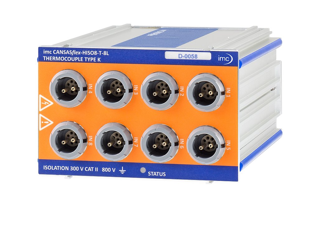 Das HV-Messmodul imc CANSASflex-HISO8-T erlaubt die sichere und präzise Messung von acht Thermoelementen (Typ K) die auf Hochspannungs-Gleichtaktniveaus von bis zu 800 V liegen. Es ist insbesondere für Anwendungen im Bereich E-Mobility prädestiniert.