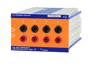 Das CAN-basierte HV-Messmodul imc CANSASflex-HISO-HV4 bietet vier isolierte Eingänge zum Messen hoher Differenzspannungen bis 800 V. Damit können beispielsweise HV-Spannungen entlang des elektrischen Antriebsstrangs erfasst werden, etwa an Batterie, Ladewandlern, Aggregaten und Verteilern.