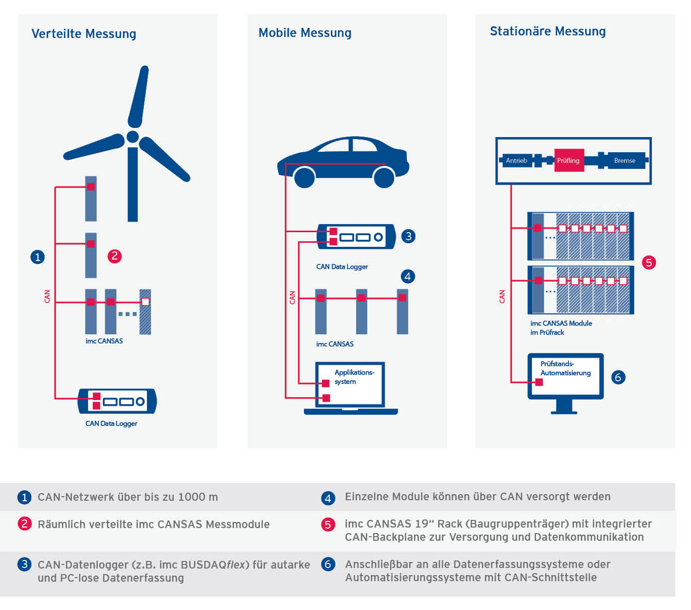 Tarkoilla mittausvahvistimilla varustettuihin imc CANSAS moduuleihin voidaan kytkeä lähes kaikentyyppiset anturit. Mittausarvot lähetetään digitaalisesti CAN-väylällä jolta ne voidaan vastaanottaa ohjausjärjestelmiin tai tiedonkeruulaitteisiin. Eräs tiedonkeruulaite joka sopii tähän täydellisesti on imc BUSDAQflex. Sen voi naksauttaa kiinni imc CANSAS moduuleihin, eikä laitteita tarvitse yhdistää väyläkaapelilla.