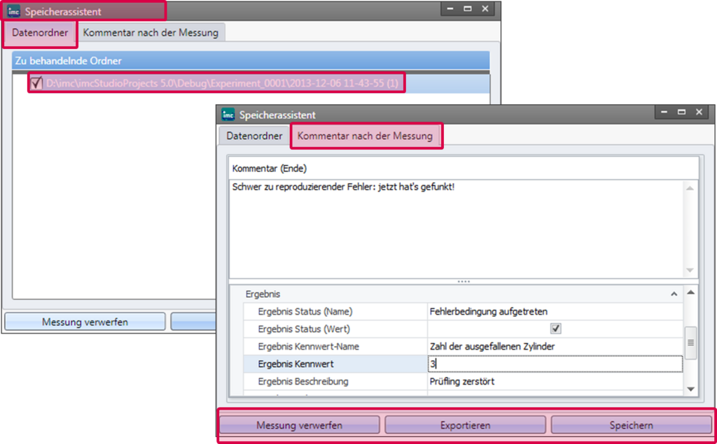 Neben dem einfachen Speichern per Checkbox steht ein erweiterter Speicherassistent zur Verfügung. Der neue Speicherassistent sorgt für mehr Komfort im Messalltag. Er fragt typische Arbeitsschritte am Ende einer Messung ab und führt diese automatisiert aus. So können Sie per Mausklick definieren: