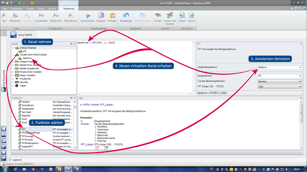Die Funktionsbibliothek bietet Analysefunktionen auf Knopfdruck. Die Anwendung ist denkbar einfach: Messkanal anwählen, auf die gewünschte Funktion ziehen und Sie erhalten einen berechneten Ergebniskanal. Mehrere Berechnungsschritte werden in einem Editor als Sequenz gespeichert und können so übersichtlich editiert und in zukünftigen Projekten geladen und wieder verwendet werden.