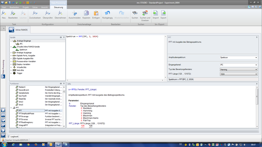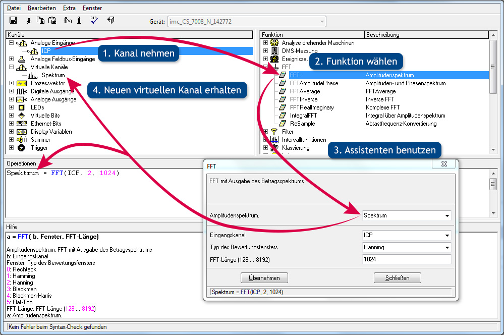 Insgesamt stehen mehr als 100 verschiedene Funktionen zur Verfügung mit denen ein imc Messgerät während der Datenaufnahme vielfältige Ergebnisse produzieren und speichern kann. Mit wenigen Mausklicks werden alle Funktionen über einen Bedienassistenten erreicht und das Messgerät in kürzester Zeit konfiguriert. Die kontinuierlich berechneten Ergebnis-Kanäle können darüber hinaus auch zur Definition von Trigger-Bedingung herangezogen werden. So können Anwender präzise, zielgerichtete und effiziente Messung durchführen und fertige Ergebnisse während der Messung erzielen!