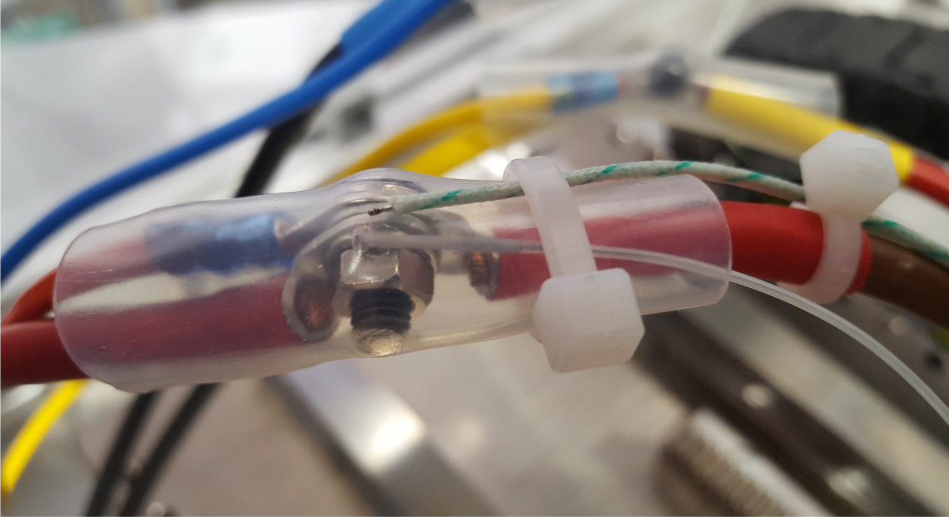 In der konkreten Anwendung wurde exemplarisch die Temperatur an einer elektrischen Zuleitung gemessen, über die gepulste PWM-Ströme den Elektromotor speisen. Dazu wurden Sensoren nahe des Motors an einer Schraubverbindung der Versorgungsleitung angebracht. Diese ist gegen Berührung mit einem transparenten Schrumpfschlauch geschützt. Im Test wurde das Thermoelement von außen mit Kabelbindern auf den Schrumpfschlauch fixiert. Die Glasfaser wurde in den Schrumpfschlauch eingeführt und direkt an der Kontaktstelle platziert.