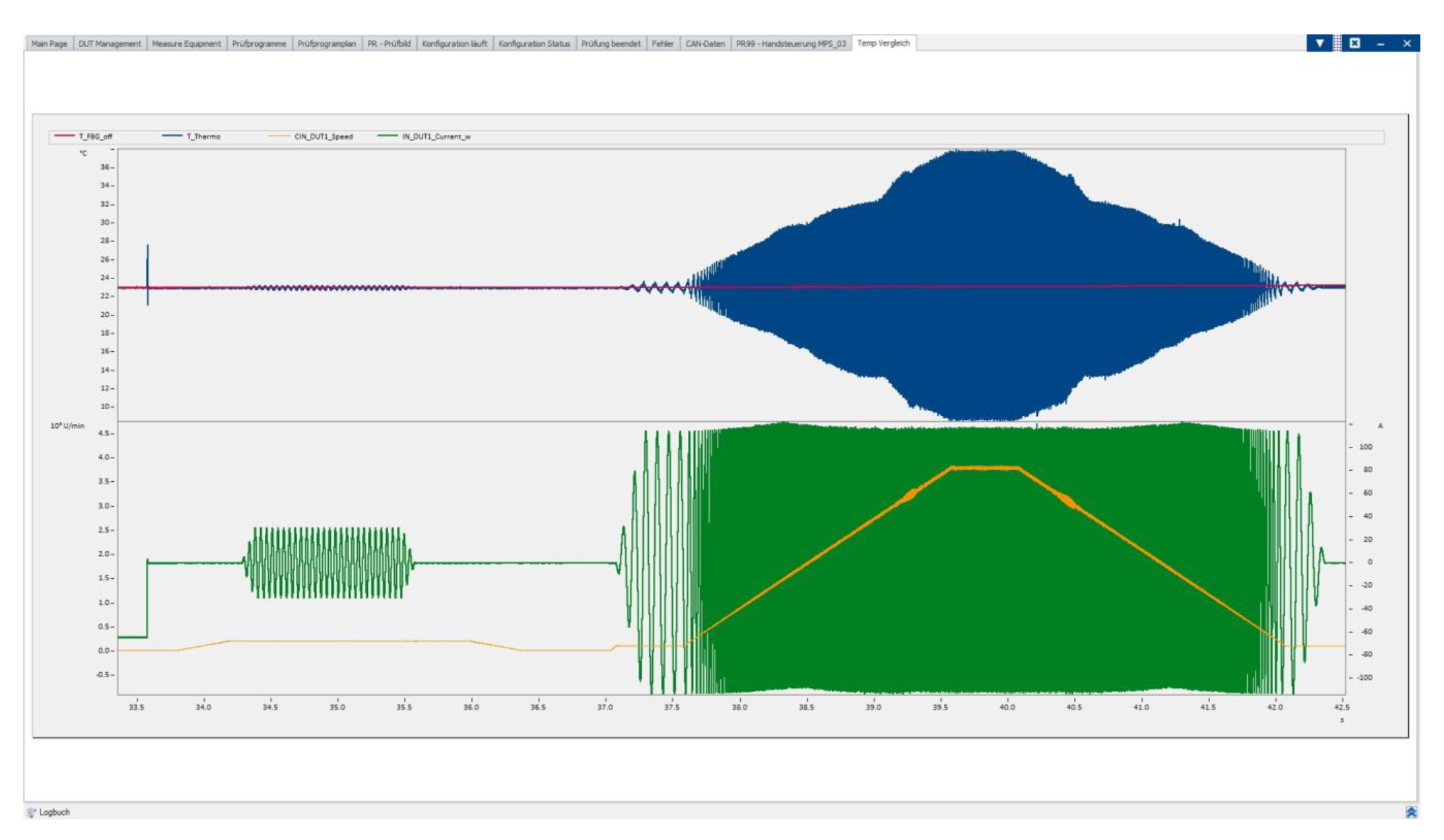 Die konkreten Auswirkungen der elektromagnetischen Störfelder auf das Thermoelement sind im nebenstehenden Diagramm visualisiert (blaue Kurve). Es ist deutlich zu erkennen, wie mit zunehmender Drehzahl und den entsprechenden Motorströmen das elektrische Thermolement massiv gestört wird. Derartige Einkopplungen über magnetische Wechselfelder lassen sich mit rein optischer FBG-Messtechnik komplett vermeiden. Die Technologie ist gänzlich immun gegen EMV-/ESD-Einflüsse, wie sich an der roten Kurve des aufgezeichneten Temperatursignals erkennen lässt.